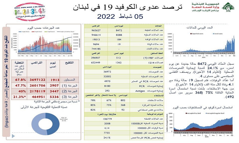 كورونا لبنان: 8472 إصابة جديدة و19 وفاة February 5, 2022 07:31 PM وكالات أعلنت وزارة الصحة العامة في تقريرها اليومي تسجيل 8472 إصابة جديدة بفيروس كورونا رفعت العدد التراكمي للحالات المثبتة الى 965627، كما تم تسجيل 19 حالة وفاة.