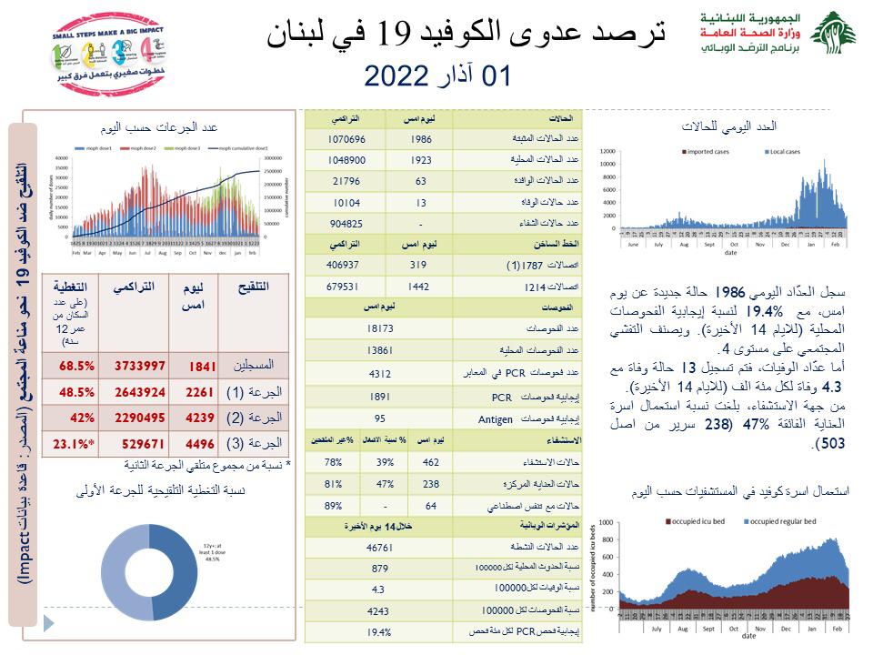 انخفاض عدّاد كورونا March 1, 2022 06:39 PM وكالات أعلنت وزارة الصحة العامة تسجيل 1986 إصابة جديدة بفيروس “كورونا” في لبنان، ما يرفع العدد الإجمالي للمصابين إلى 1070696. كما أعلنت تسجيل 13 حالة وفاة جديدة بالفيروس ترفع الحصيلة الإجمالية للمتوفين إلى 10104.