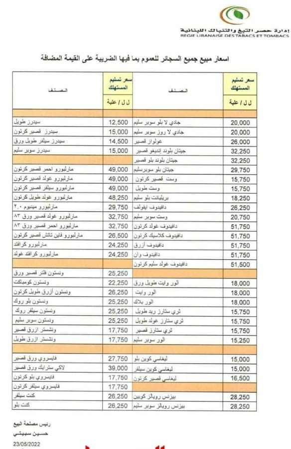 أسعار جديدة للمعسّل والدخان May 24, 2022 09:13 PM وكالات أصدرت إدارة حصر التنبع والتنباك “الريجي” قائمة جديدة بأسعار التبغ والسجائر والمعسل. تجدون الأسعار الجديدة بالصور المرفقة: