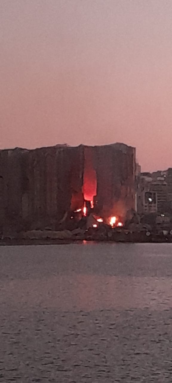 يستمر الحريق في مبنى الاهراءات بمرفأ بيروت لليوم السابع، وتُظهر الصور أن النيران تشتد.