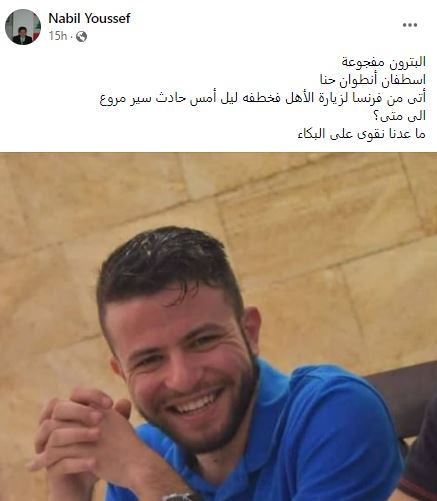 اسطفان… أتى من فرنسا لزيارة أهله فخطفه الموت! July 17, 2022 11:37 AM وكالات فجعت البترون بوفاة المهندس الشاب اسطفان أنطوان حنا الذي توفي اثر حادث سير مروع. وأتى اسطفان من فرنسا لزيارة اهله.