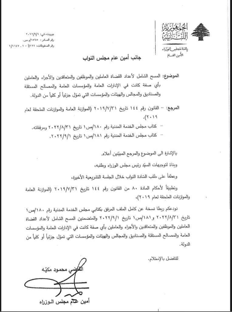 أرسلت رئاسة مجلس الوزراء إلى مجلس النواب كتاباً يتضمّن المسح الشامل لأعداد القضاة العاملين والموظفين والمتعاقدين والأجراء والعاملين بأي صفة كانت في الإدارات العامة والمؤسسات العامة والمصالح المستقلة والصناديق والمجالس والهيئات والمؤسسات التي تموّل جزئياً أو كلياً من الدولة.