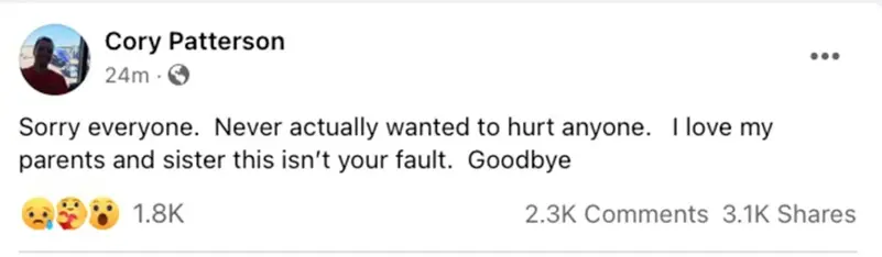 إلى ذلك، نشرت صحيفة “نيويورك بوست” صورة له، لافتة إلى أنه كتب منشورا عبر صفحته على “فيسبوك” في وقت مبكر السبت، قال فيه: “أعتذر للجميع.. لم أرغب أبدًا في إيذاء أي شخص.. أنا أحب والدي ووالدتي وأختي، هذا ليس خطأك.. مع السلامة”.