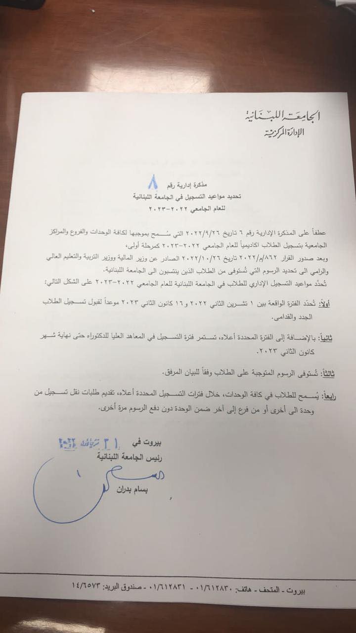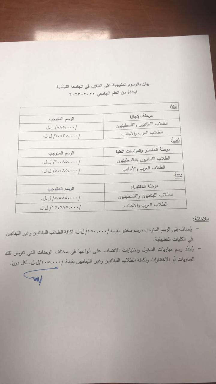 رفع الرسوم في الجامعة اللبنانية! October 31, 2022 05:32 PM وكالات أصدرت الإدارة المركزية في الجامعة اللبنانية مذكرة حدّدت بموجبها مواعيد التسجيل, ولأوّل مرّة منذ سنوات عديدة, رفعت الرسوم المتوجبة على الطلاب خلال العام الجامعي 2022-2023, وفق الآتي:
