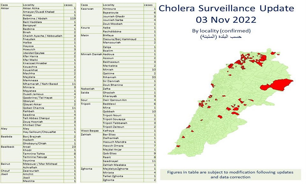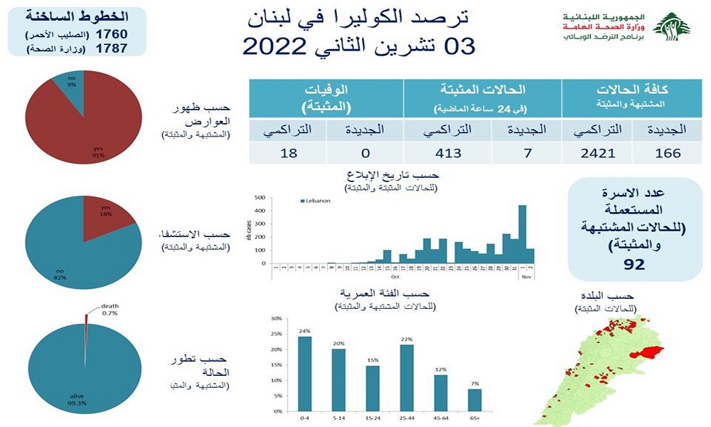 7 إصابات جديدة بالكوليرا في لبنان November 3, 2022 11:10 PM وكالات أعلنت وزارة الصحة العامة تسجيل 7 إصابات جديدة بالكوليرا في لبنان، من دون تسجيل أي وفيات. التفاصيل في الصور المرفقة: