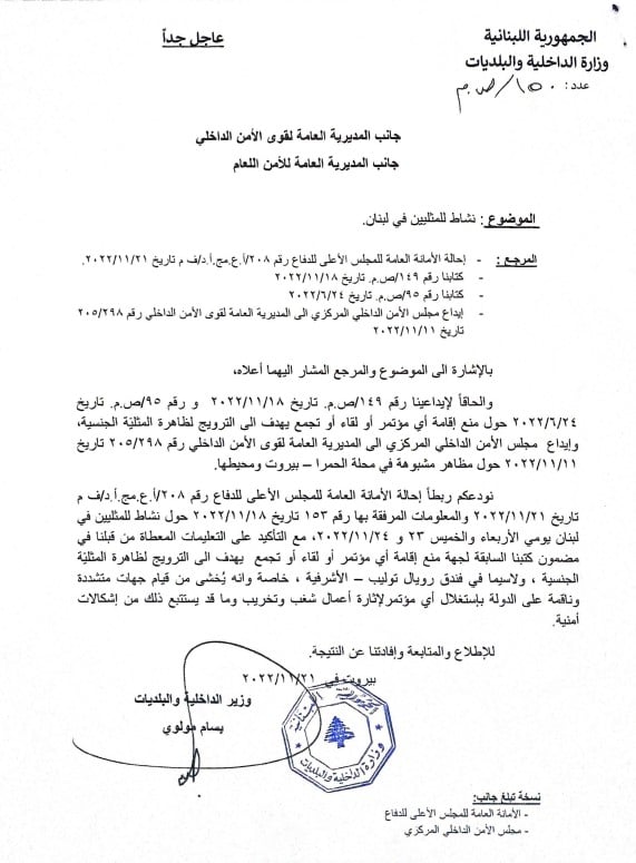 وجّه وزير الداخلية والبلديات في حكومة تصريف الأعمال بسام مولوي كتاباً الى كل من المديرية العامة لقوى الأمن الداخلي والمديرية العامة للأمن العام، استناداً إلى إحالة الأمانة العامة للمجلس الأعلى للدفاع حول نشاط للمثليين في لبنان، غداً الأربعاء والخميس.