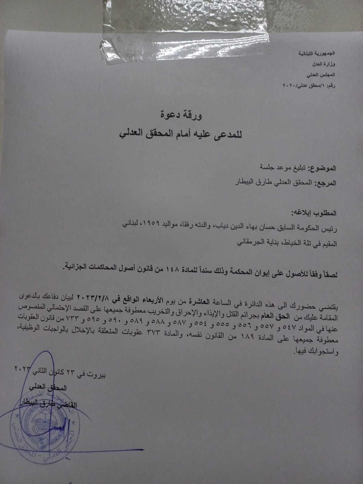 عيّن المحقّق العدلي في قضية إنفجار مرفأ بيروت القاضي طارق البيطار، جلسات استجواب لكل من النائب غازي زعيتر في 6 شباط المُقبل والنائب نهاد المشنوق في 6 شباط المقبل ورئيس الحكومة السابق حسان دياب في 8 شباط المقبل.