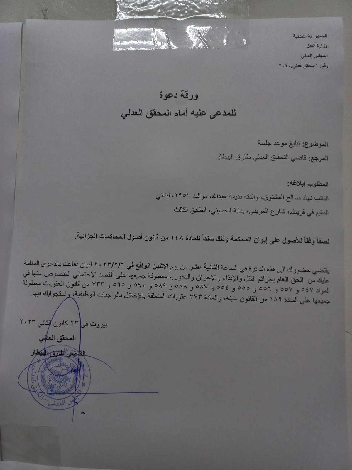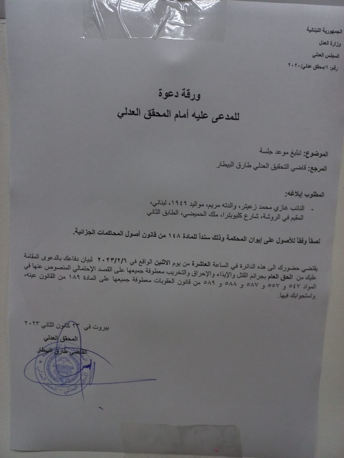 عيّن المحقّق العدلي في قضية إنفجار مرفأ بيروت القاضي طارق البيطار، جلسات استجواب لكل من النائب غازي زعيتر في 6 شباط المُقبل والنائب نهاد المشنوق في 6 شباط المقبل ورئيس الحكومة السابق حسان دياب في 8 شباط المقبل.