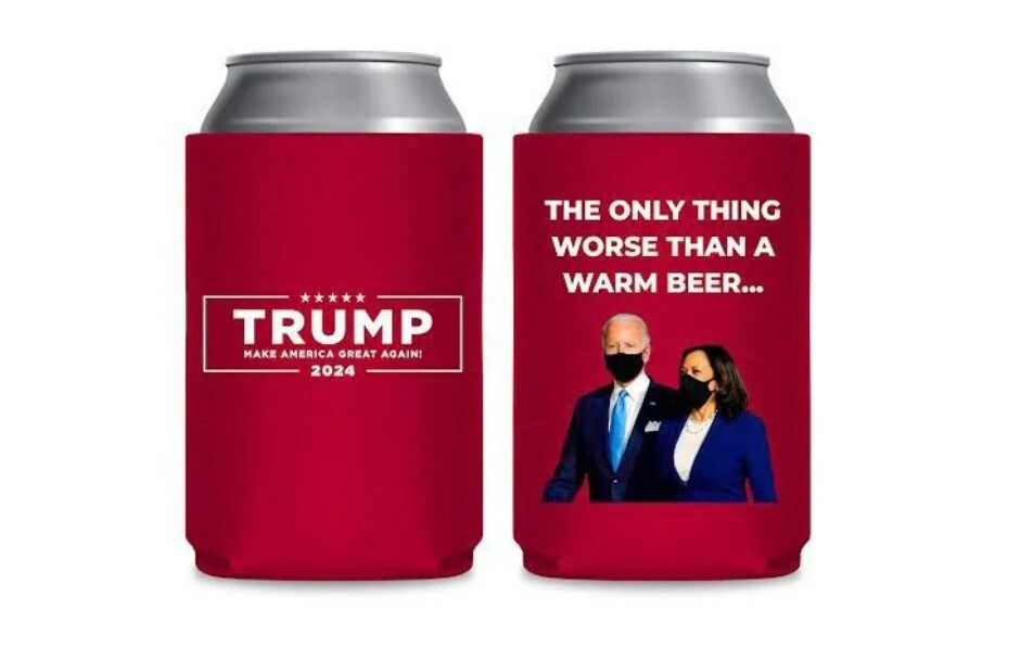 وكشف ترامب في رسالة بريد إلكتروني من حملة Make America Great Again (MAGA)، عن منتج يستخدم لإبقاء المشروبات باردة (cooler sleeves)، وعليه صورة لبايدن ونائبته كمالا هاريس برسالة مفادها بأنهما “الشيء الوحيد الأسوأ من الجعة الدافئة”.