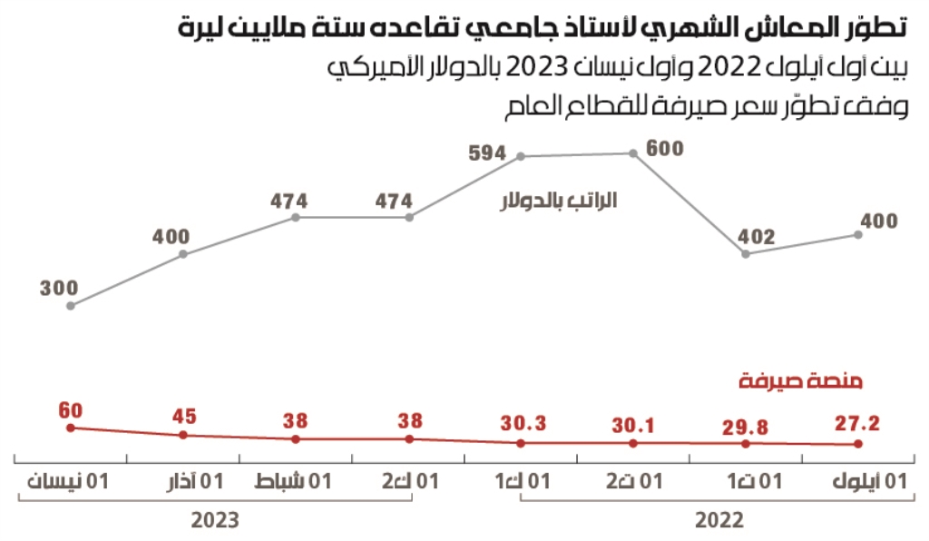 يُظهِر الخط البيانيّ (باللون الرمادي) في الصّورة المرفقة تطور المعاش الشهري للأستاذ الجامعي. كما يُظهِر الخط البيانيّ (باللون الأسود) تطوّر سعر صيرفة للقطاع العام. ويتضح من هذا الرسم أن المعاش كان 440 دولاراً ثم 402 دولار في كلٍّ من أيلول وت1 من عام 2022، وكانت قد أُقرّت آنذاك مساعدة اجتماعية واحدة للعاملين والمتقاعدين في القطاع العام، بعدها أُقِرت مساعدة ثانية ليصبح المعاش مضروباً بثلاثة أضعاف، فارتفع الدخل الشهري إلى 600 دولار.