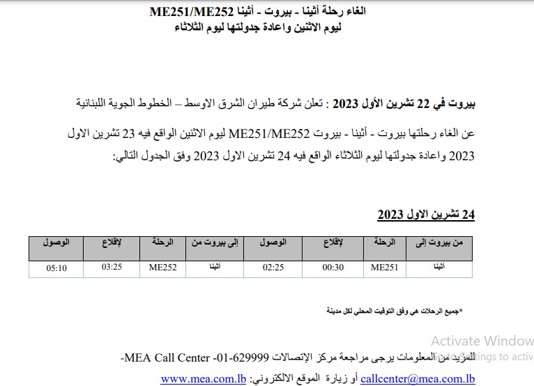 طيران الشرق الاوسط يعلن إلغاء رحلة الاثنين October 22, 2023 12:58 PM وكالات أعلنت شركة طيران الشرق الاوسط – الخطوط الجوية اللبنانية عن الغاء رحلتها بيروت – أثينا – بيروت ME251/ME252 ليوم الاثنين الواقع فيه 23 تشرين الاول 2023 واعادة جدولتها ليوم الثلاثاء الواقع فيه 24 تشرين الاول 2023.