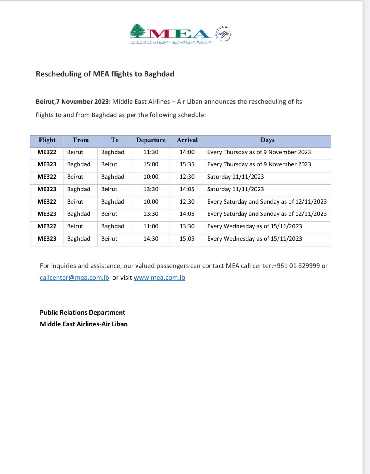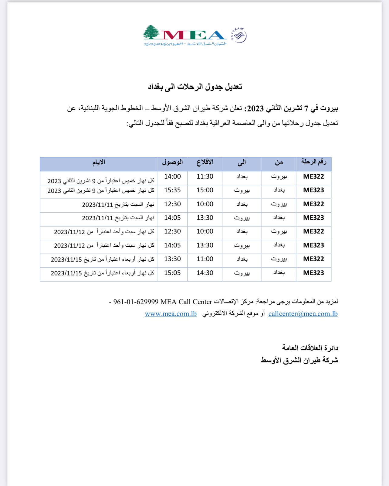 الـ”MEA” تعدل رحلاتها إلى بغداد November 7, 2023 02:58 PM وكالات أعلنت شركة طيران الشرق الأوسط – الخطوط الجوية اللبنانية عن تعديل جدول رحلاتها من وإلى العاصمة العراقية بغداد.
