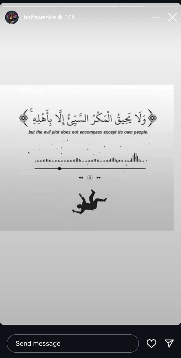 لم تصدر الفنانة اللبنانية هيفا وهبي تعليقاً رسمياً بشأن منعها عن العمل الفني في مصر، حيث اكتفت بنشر جزء من الآية ذات الرقم 43، من سورة فاطر القرآنية، عبر خاصية “ستوري” من حسابها الرسمي على إنستغرام، والتي تقول: “وَلَا يَحِيقُ الْمَكْرُ السَّيِّئُ إِلَّا بِأَهْلِه”.