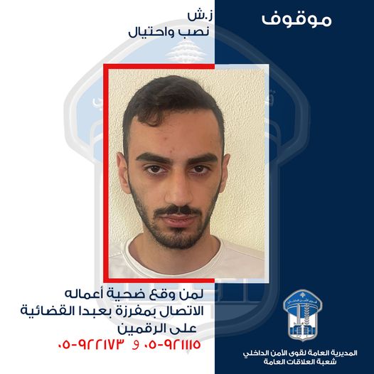 عممت المديريّة العامّة لقوى الأمن الدّاخلي بناء على إشارة القضاء المُختصّ، صورة الموقوف ز. ش. (مواليد عام 2003، لبناني) الذي أقدم على تقاضي مبالغ مالية من عدد من الأشخاص والجمعيات، مقابل تأمين فرش وحرامات للنازحين، وتوارى عن الأنظار.