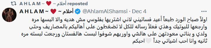 نشرت الفنانة الإماراتية أحلام الشامسي، رسالة عبر حسابها على منصة إكس، للرد على الجدل القائم على مواقع التواصل الاجتماعي، حيث طالتها موجة من الانتقادات بسبب ارتدائها الفساتين نفسها مرات عدة.