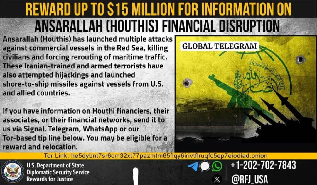أعلنت وزارة الخارجية الأميركية مكافأة مالية تصل إلى 15 مليون دولار، بالإضافة إلى فرصة الحصول على الجنسية الأميركية، لمن يدلي بمعلومات تساعد في كشف الشبكة المالية للحوثيين أو تسهم في الوصول إلى قياداتهم الفاعلة داخل اليمن وخارجه.