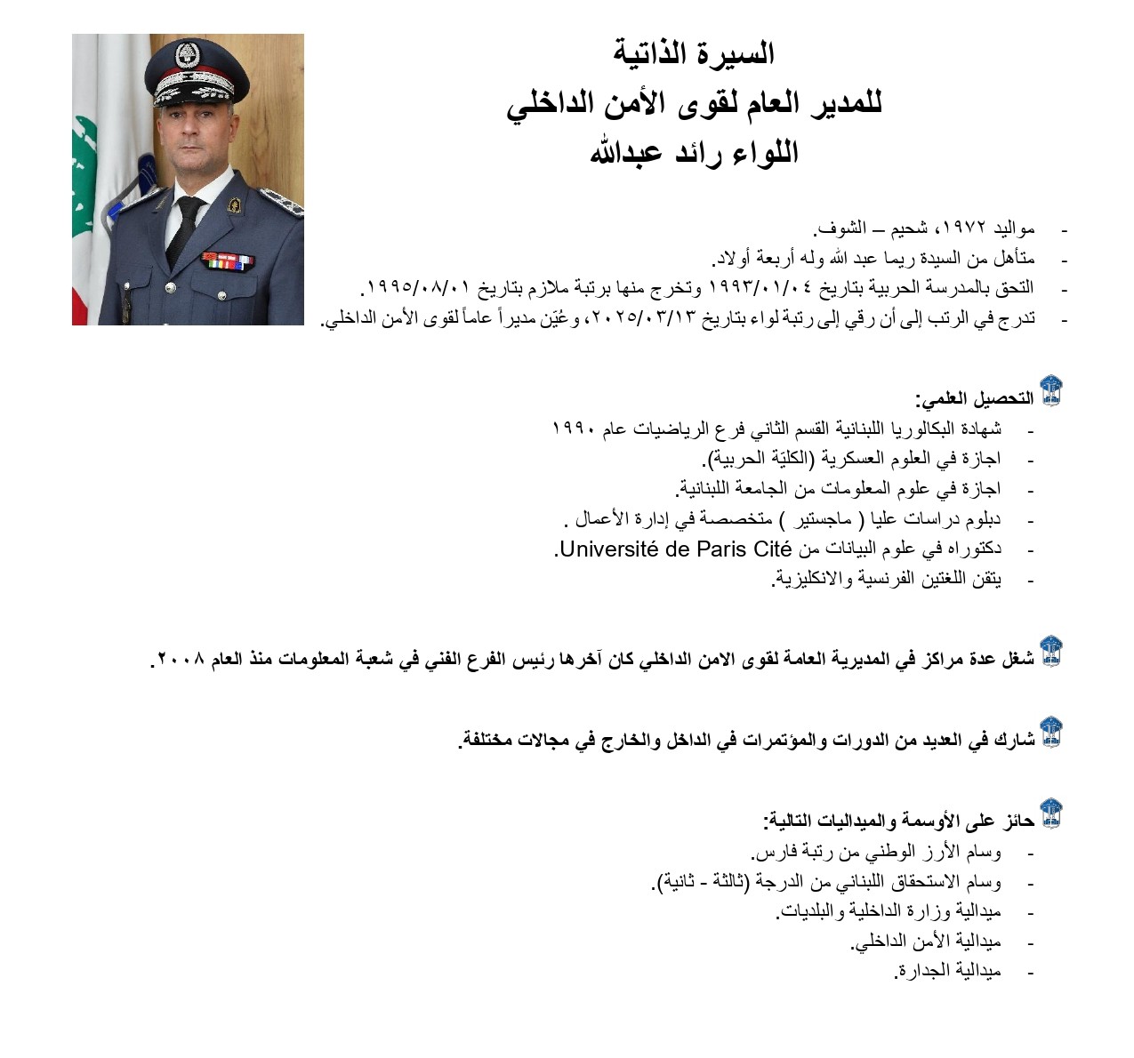 السيرة الذاتيّة للمدير العام لقوى الامن الداخلي March 13, 2025 09:25 PM وكالات وزعت المديرية العامة لقوى الامن الداخلي، السيرة الذاتيّة للمدير العام الجديد اللواء رائد عبدالله.