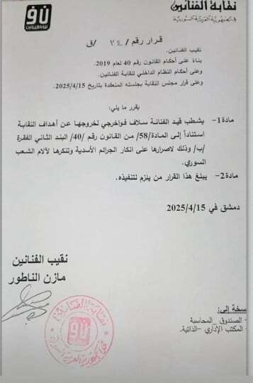 ويتم توقيع القرار من قبل نقيب الفنانين السوريين مازن الناطور.