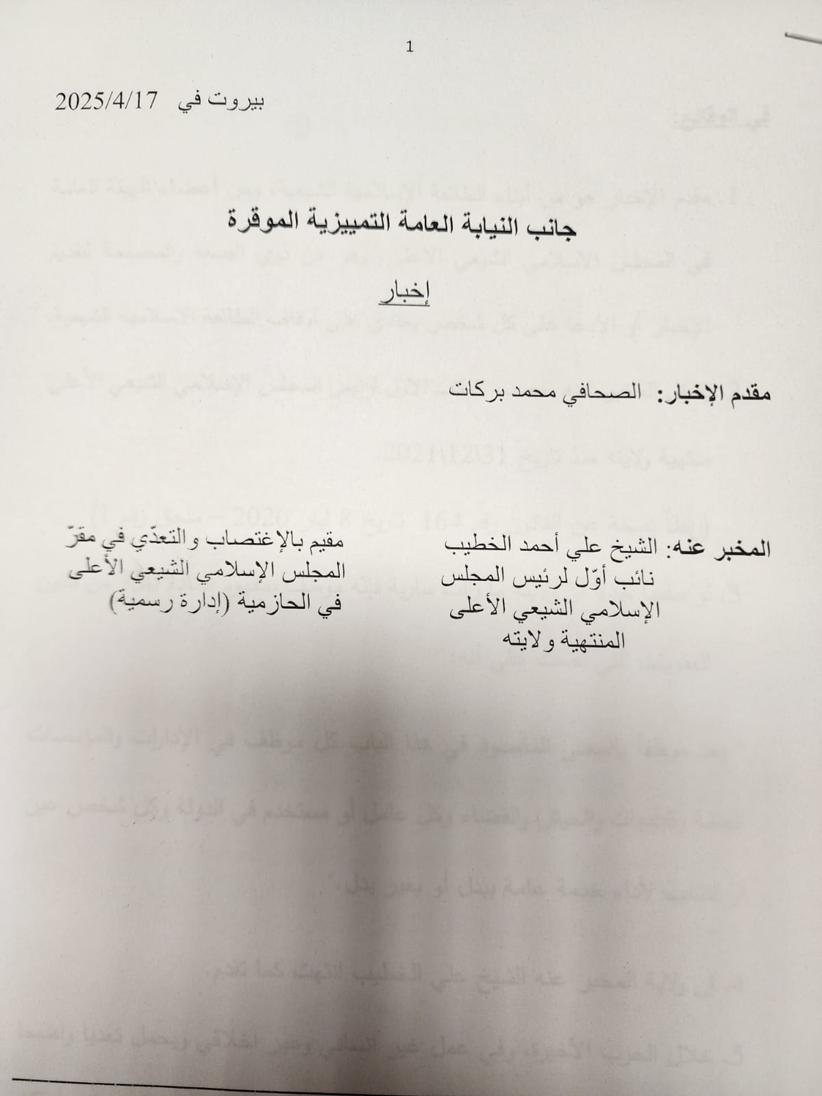 إخبار للنيابة العامة ضد الشيخ علي الخطيب April 22, 2025 12:01 PM وكالات تقدّم الصحافي محمد بركات، اليوم الثلاثاء، بإخبار إلى النيابة العامة التمييزية بوجه نائب رئيس المجلس الإسلامي الشيعي الأعلى الشيخ علي الخطيب، بجرم الإقامة بالتعدّي في مقرّ المجلس بالحازمية.