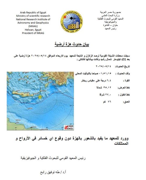 وفي بيان رسمي من المعهد القومي للبحوث الفلكية والجيوفيزيقية -مرصد حلوان عن الزلزال ، تبين أنه “بقوة 6.4 على مقياس ريختر ويبعد عن شواطئ مصر 431 كم وعمق الزلزال 76 كم”.