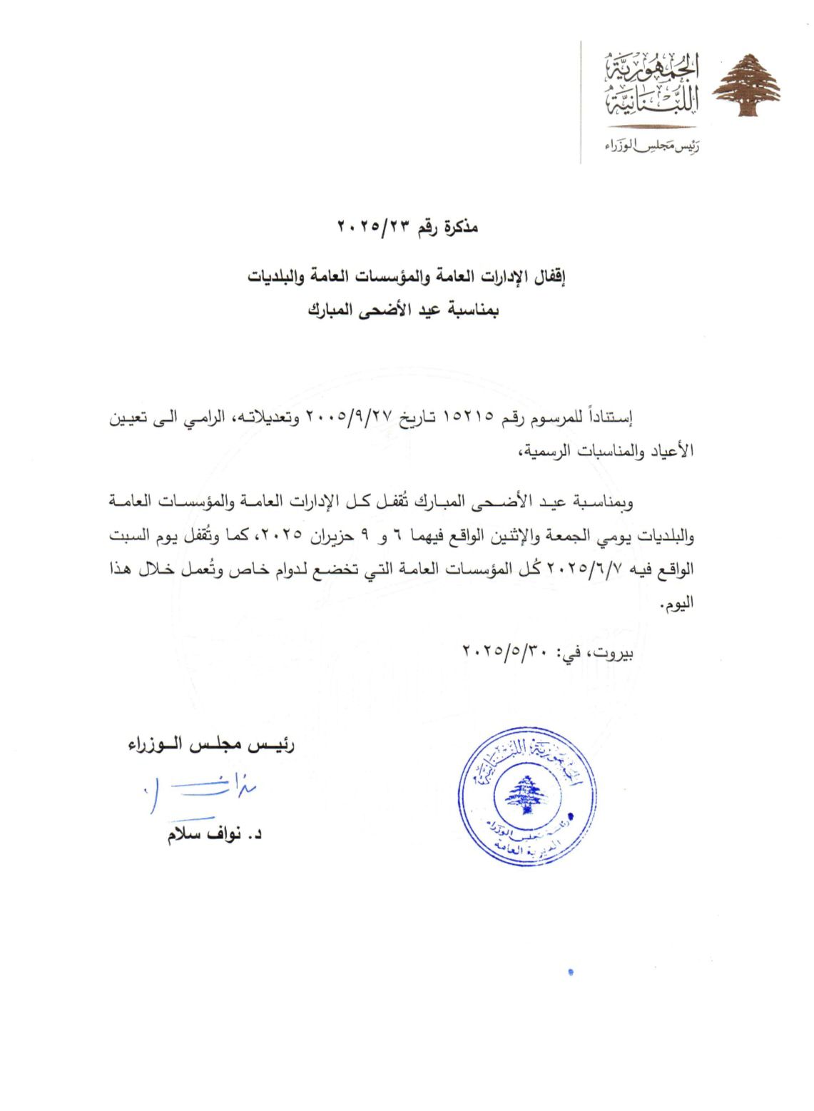 إليكم موعد عطلة عيد الأضحى May 30, 2025 04:42 PM وكالات أعلنت رئاسة مجلس الوزراء اقفال كل الإدارات العامة والمؤسسات العامة والبلديات يومي الجمعة والاثنين الواقع فيهما 6 و9 حزيران 2025، بمناسبة عيد الأضحى المبارك.