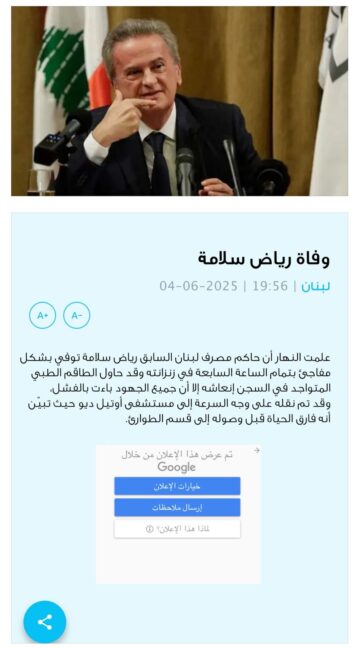 خبر مزور عن وفاة رياض سلامة! June 4, 2025 10:17 PM وكالات إنتشر خبر مزور منسوب الى “النهار” عن وفاة حاكم مصرف لبنان السابق رياض سلامة. وبدورها، نفت “النهار” هذا الخبر.