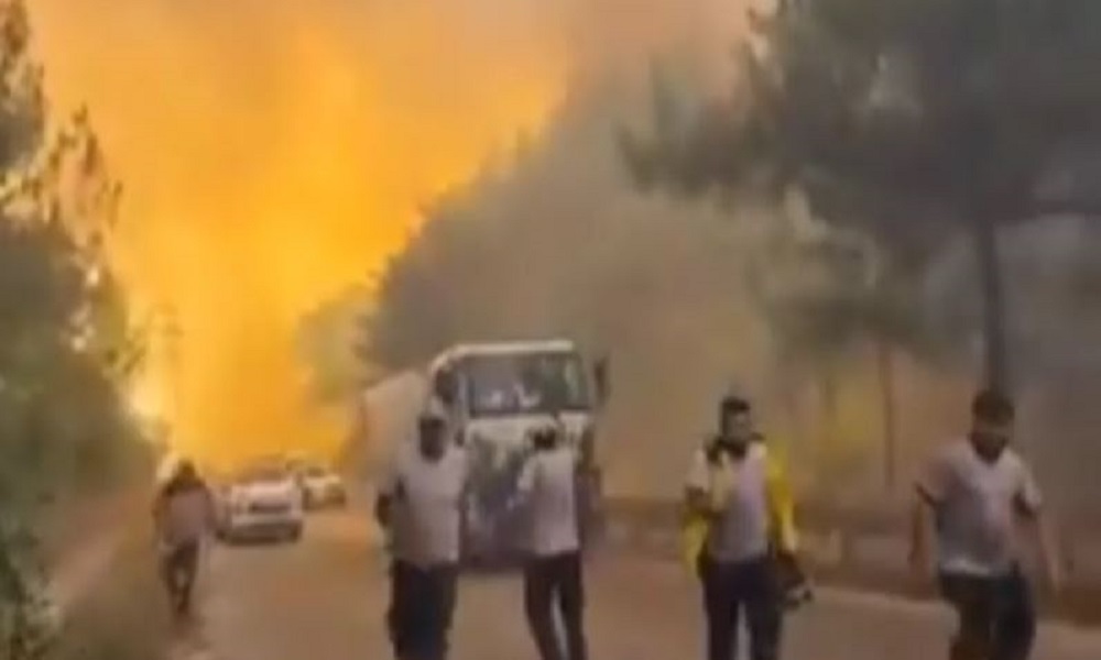 ويظهر المقطع رجال الإطفاء وهم يحاولون الابتعاد عن ألسنة النيران بعد أن امتدت بسرعة في إحدى مناطق اللاذقية التي امتدت إليها النيران.