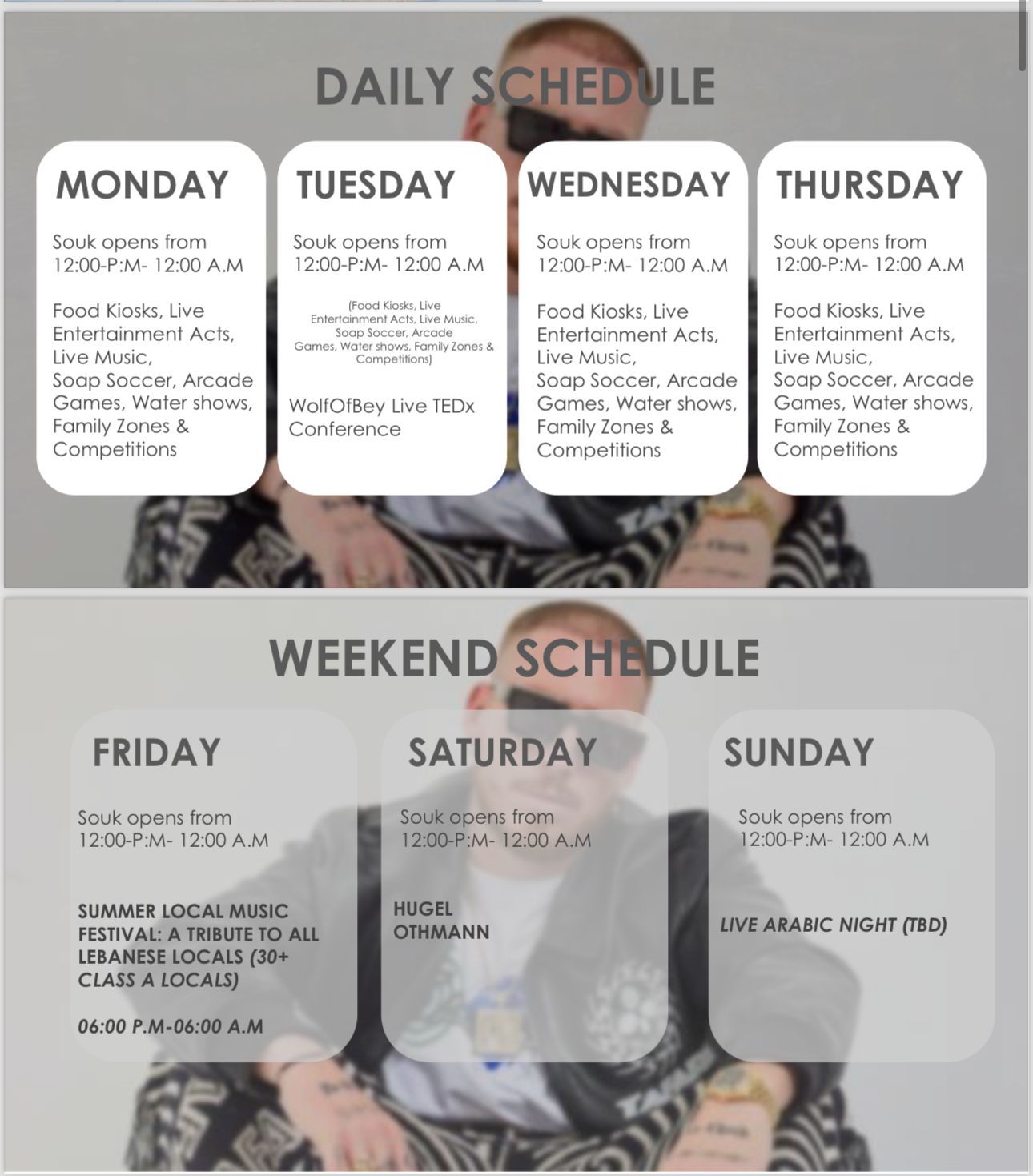 ويشمل المهرجان، منطقة Arcade مع ملعب كرة سلة بإشراف خبراء رياضيين اضافة الى مسرح استعراضي والعاب لايزر وأكشاك طعام ومشروبات منوّعة.