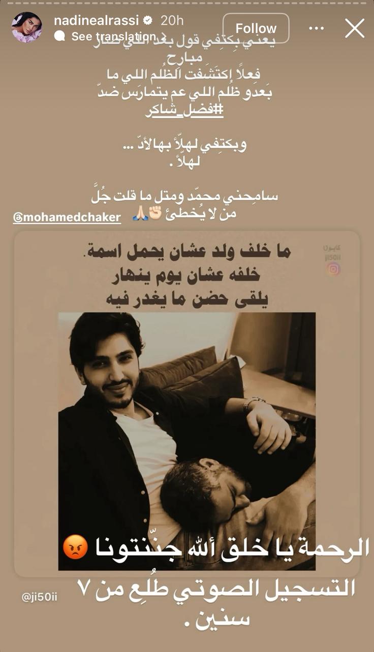 نشرت الممثلة نادين الراسي على خاصية الستوري على انستغرام منشوراً قدّمت من خلاله اعتذاراً علنيًا للفنان فضل شاكر ونجله محمد، بعد هجومها الأخير عليهما مؤكدة أنها تسرّعت في الحكم.