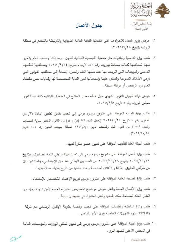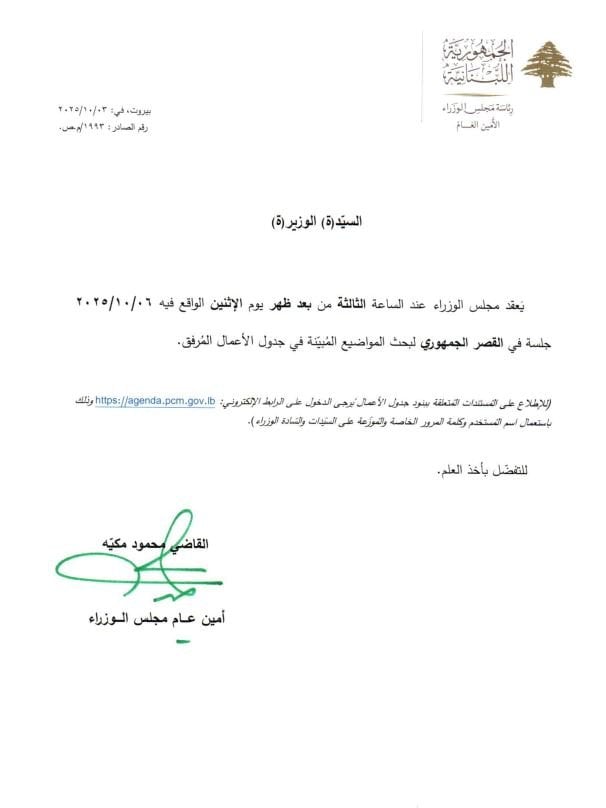 جلسة للحكومة الاثنين October 3, 2025 04:52 PM وكالات يعقد مجلس الوزراء عند الساعة الثالثة من بعد ظهر يوم الإثنين الواقع في 6 – 10 – 2025 جلسة في القصر الجمهوري.