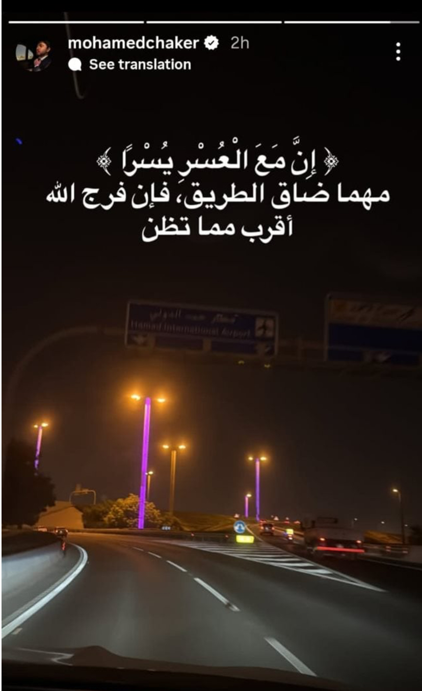 ونشر محمد شاكر على حسابه في “إنستغرام”، عبارة قال فيها: “إن مع العسر يسرا.. مهما ضاق الطريق فإن فرج الله أقرب مما تظن”.
