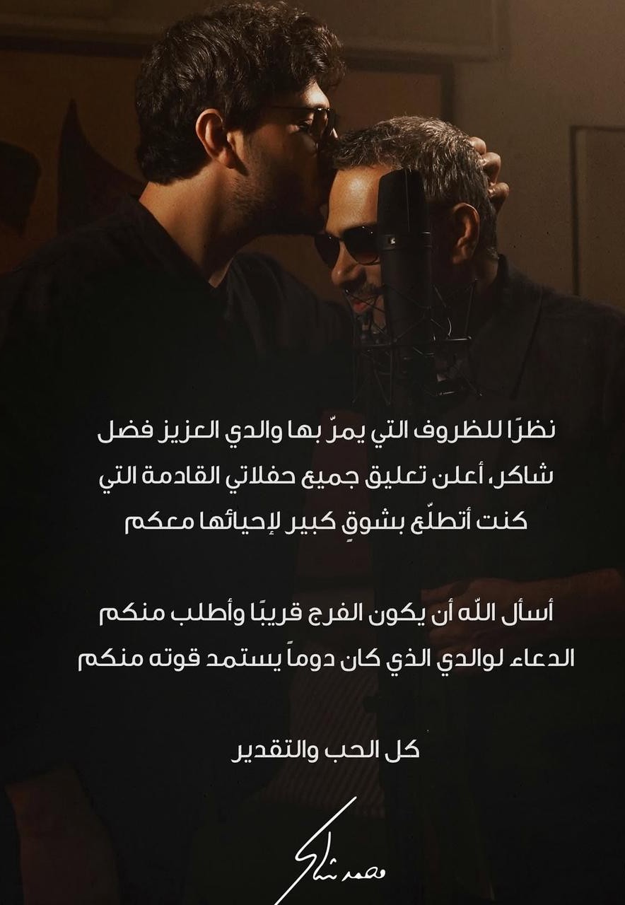 وقال محمد شاكر في بيان: “نظراً للظروف التي يمرّ بها والدي العزيز فضل شاكر، أعلن تعليق جميع حفلاتي القادمة التي كنت أتطلّع بشوقٍ كبير لإحيائها معكم”.