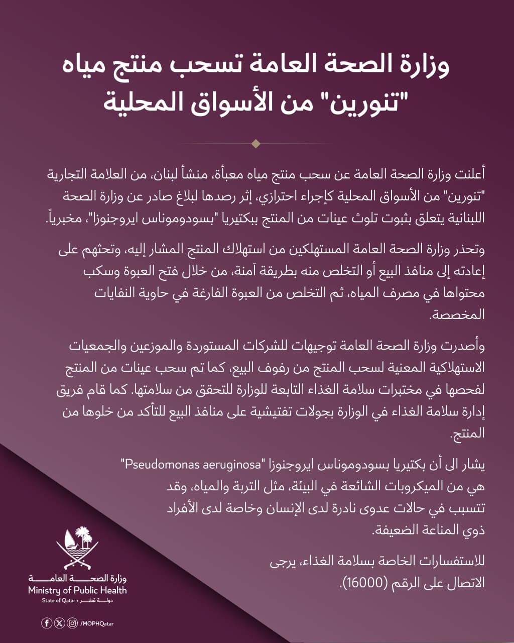 الصحة القطرية تعلن سحب منتجات “تنورين” من الأسواق October 14, 2025 05:41 PM وكالات أعلنت وزارة الصحة القطرية بعد ظهر اليوم الثلثاء، سحب منتجات “تنورين” من الأسواق.