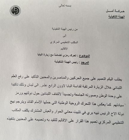 “حركة أمل” لمناصريها: ارفعوا العلم اللبناني خلال زيارة البابا! November 29, 2025 01:14 PM وكالات أصدرت حركة أمل، تعميماً داخلياً، تتوجه من خلاله لجميع الحركيين والمناصرين، تأكيداً على رفع العلم اللبناني خلال الزيارة المرتقبة لقداسة البابا لاوون الرابع عشر إلى لبنان.