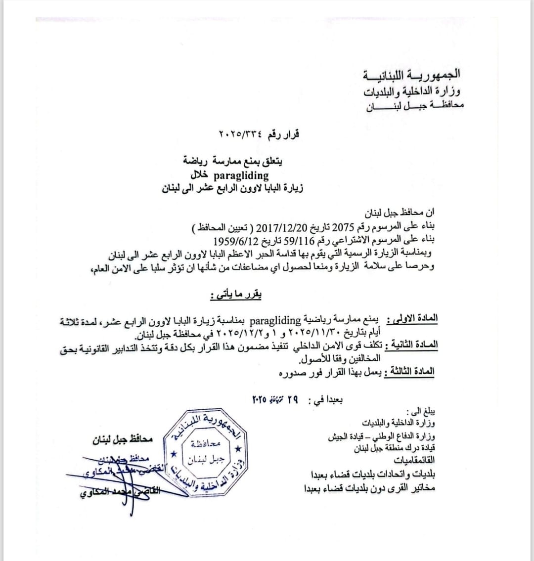 الـparagliding ممنوع خلال زيارة البابا November 29, 2025 02:52 PM وكالات أصدر محافظ جبل لبنان محمد المكاوي قراراً يتعلّق بمنع ممارسة رياضة الـ paragliding خلال زيارة البابا لاوون الرابع عشر إلى لبنان.