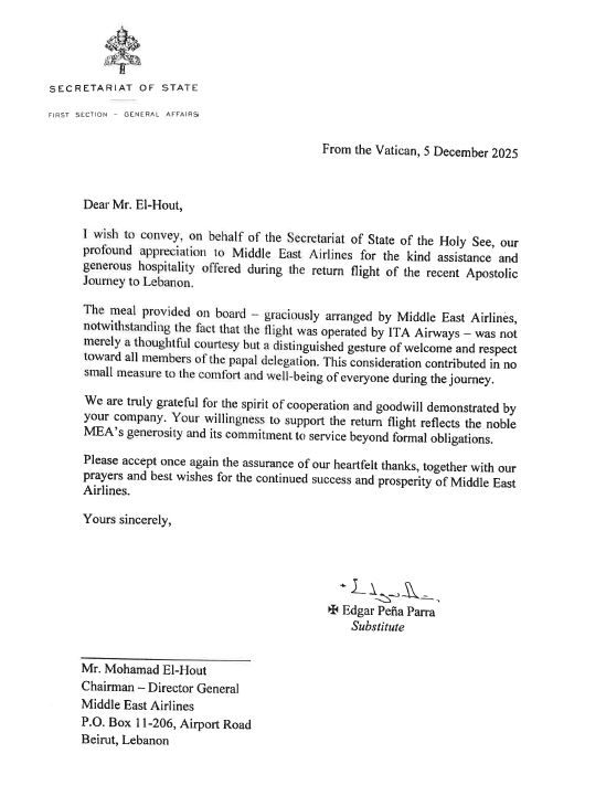 وختمت الرسالة بتجديد الشكر العميق، مقروناً بالصلوات وأطيب التمنيات باستمرار النجاح والازدهار لشركة طيران الشرق الأوسط.